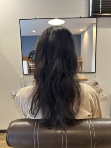 施術前のお客様の髪は、触るとゴワゴワとした質感で、見た目にも艶がなく、少しパサついた印象でした。くせによるうねりもあって、まとまりにくそうな状態。お客様ご自身も、毎朝のスタイリングに時間がかかって大変だとおっしゃっていました。