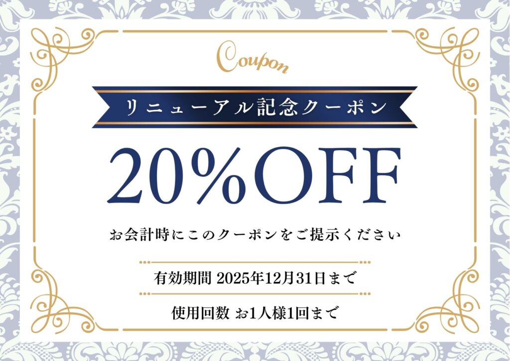 リニューアルを記念して20%OFFクーポンを期間限定で配布しております。